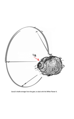 The White Flower II is described in stories as being a circular ship with 25 floors to it, while having a circular gate: a giant zero-width gate that allows vessels to travel from two discontinuous points in space. But this simple description has resulted in two different interpretations between Gre7g Luterman and Rick Griffin.
